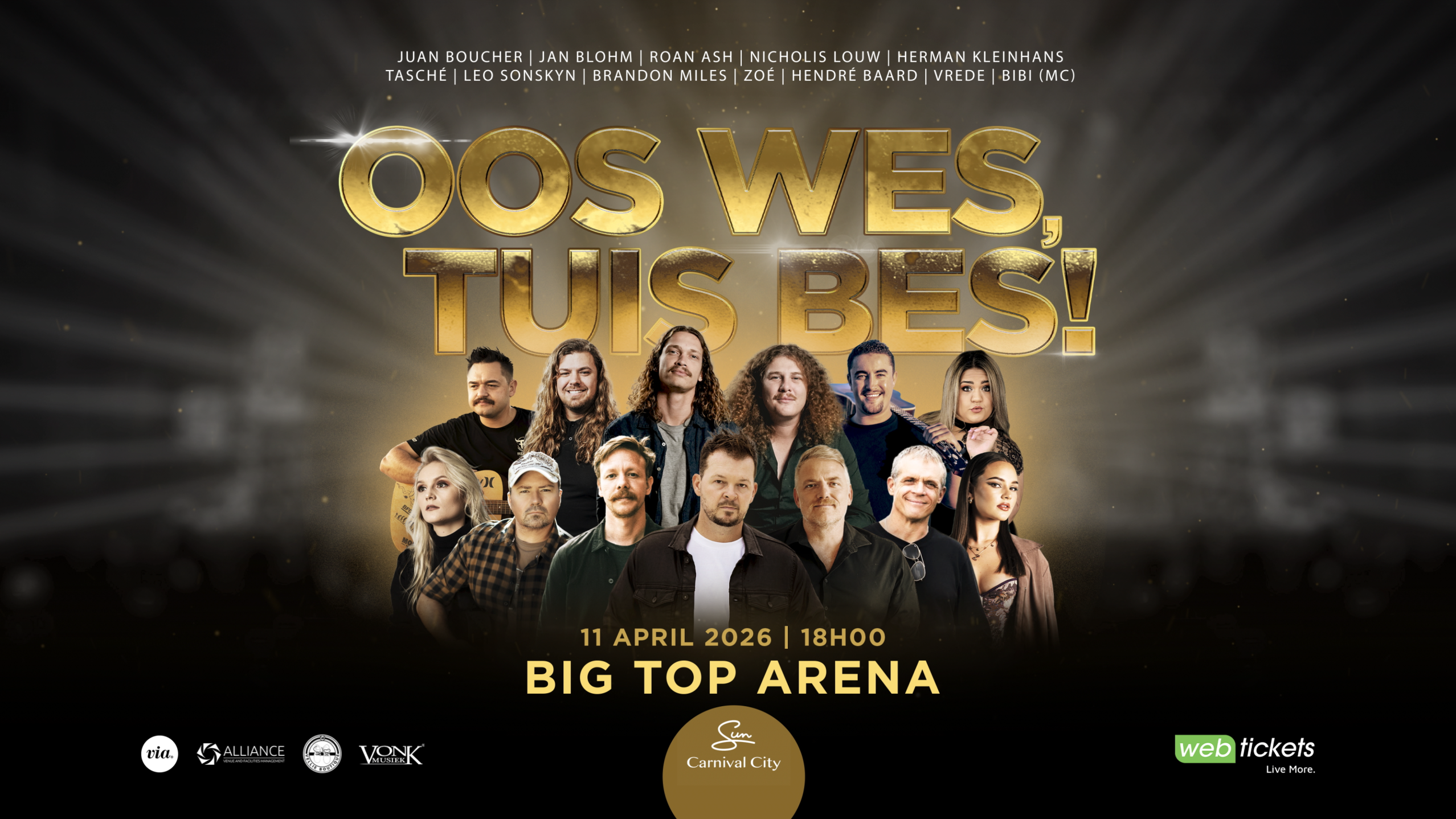 Die Big Top Arena by Carnival City gaan op 11 April 2026 behoorlik skud wanneer die grootse musiekviering Oos Wes Tuis Bes weer sy opwagting maak. Met die tema “Jou Dorp · Jou Taal · Jou Trots · Jou Tuiste” beloof hierdie jaar se produksie om nie net ’n musiekaand te wees nie, maar ’n viering van alles wat Afrikaans en Suid-Afrika uniek maak.