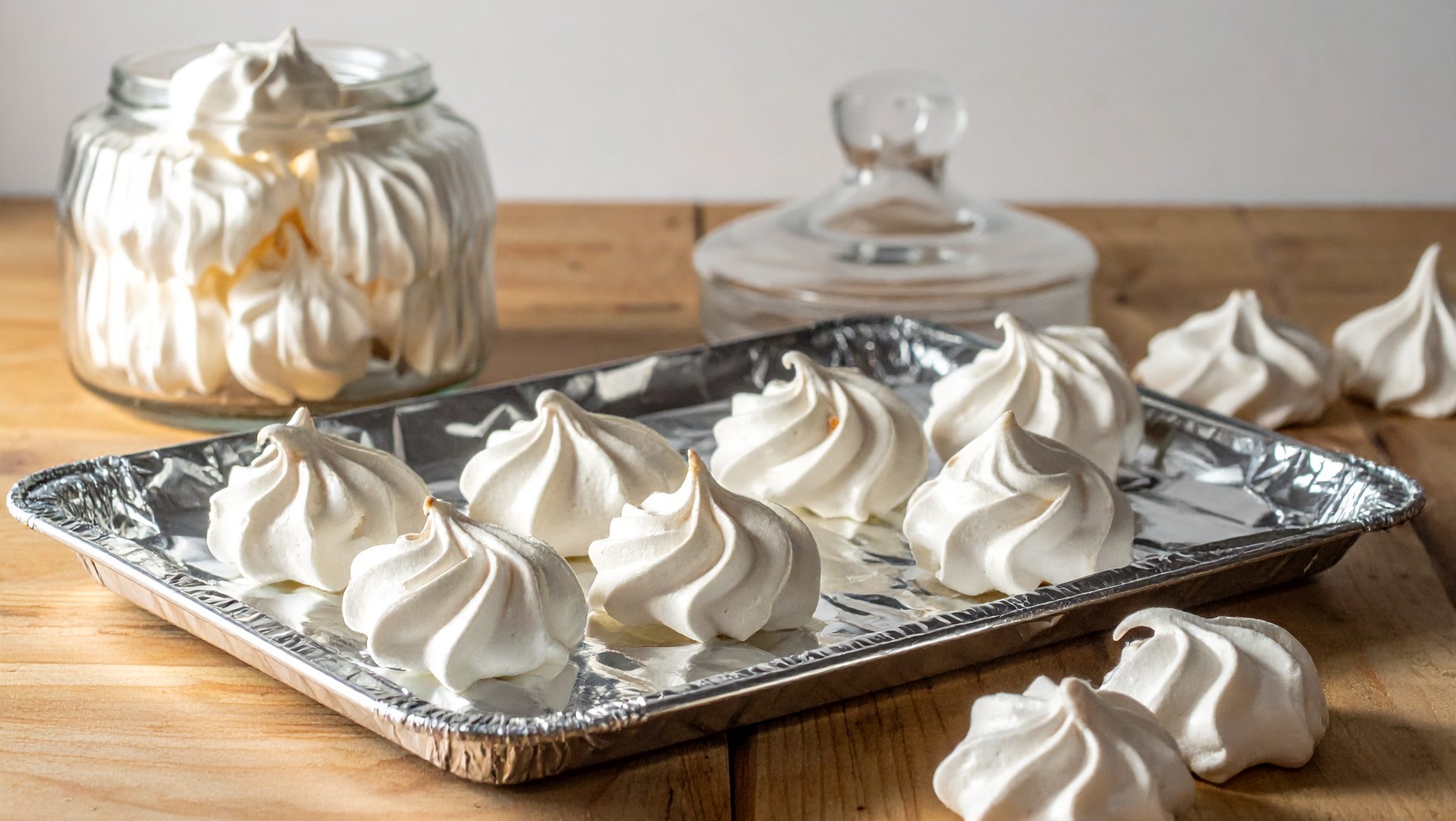 1. Voorverhit die oond tot 100 °C. Voer twee bakplate uit met aluminiumfoelie, met die blink kant bo. Plaas die eierwit, strooisuiker, kookwater en asyn in ’n mengbak. Klits dit vinnig totdat die meringue stywe punte vorm wanneer jy die klitser oplig. Vou die bakpoeier liggies in die meringue in. Skep teelepelsvol meringue op die aluminiumfoelie, of spuit sirkels met behulp van ’n versierbuis en -sak. Die deursnee van die skuimpies moet ongeveer 4 cm wees. Bak die skuimpies vir 1½ uur. Skakel die oond af en laat hulle binne totdat die oond byna koud is. Bêre die skuimpies in ’n lugdigte houer.
